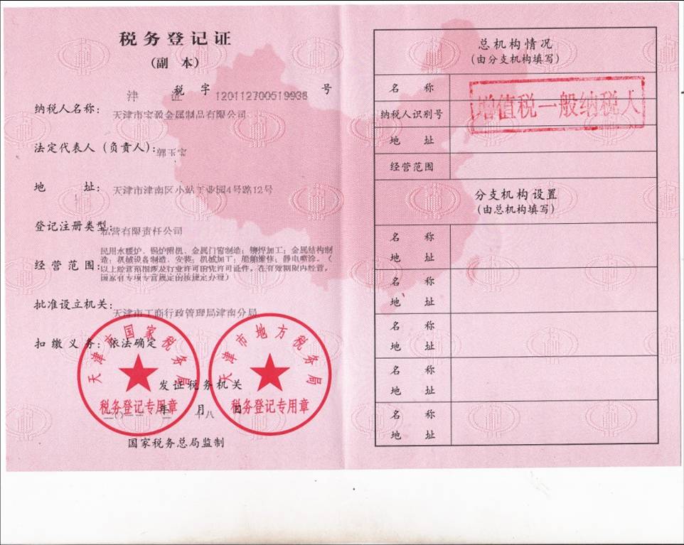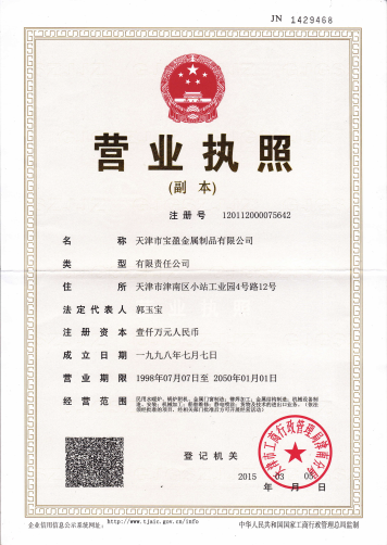 天津市寶盈金屬制品有限公司成立于1998年,公司坐落于天津市津南區(qū)小站工業(yè)園。距津港高速公路2公里,塘沽港25公里,天津?yàn)I海國際機(jī)場25公里,海、陸、空交通十分便利。公司占地面積10000平方米,年生產(chǎn)能力4500噸金屬制品,包括辦公室人員及車間工人寶盈共有100多名員工。 2010年6月2日,通過了ISO9001:2008質(zhì)量管理體系認(rèn)證,2012年5月由摩迪國際進(jìn)行焊工考試,取得EN 287-1焊工資格證書。